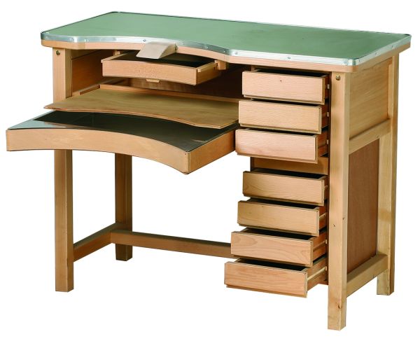 1-seat wooden workbench, with center shaped pull-out trays (lined with zinc) and 8 lateral drawers.